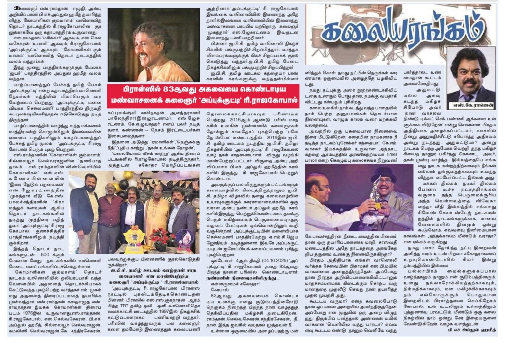 இன்று அகவை எழுபத்தைந்து காணும் “அப்புக்குட்டி” ராஜகோபால் அண்ணர் பொன் விழா கடந்த ஈழத்துக் கலைஞர். ஐபிசி தமிழா 2017 இல் வாழ் நாள் சாதனையாளர் விருது கொடுத்துக் கெளரவிக்கப்பட்டவர்.